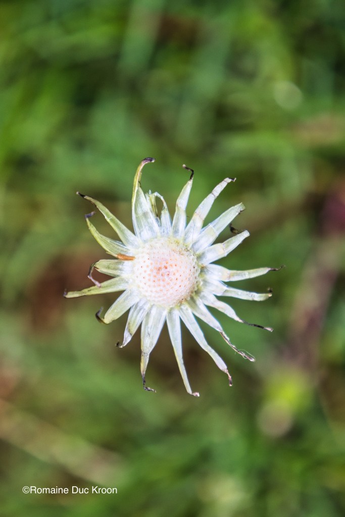 Je remarque que pas mal de petites boules blanches ont été décimées par la pluie et le vent, leurs fortes tiges sont bien ancrées dans le pré. Quelque chose auquel je n’avais jamais prêté attention capte mon attention. Je m’arrête brusquement pour admirer une fleur en forme d’étoile, ses bords violets, son coeur blanch crémeux est parsemé de petits points. Cet étoile resplendit et brille sous le ciel gris. Pourquoi n’ai-je jamais enregistré cela auparavant. Je la trouve tellement belle que j’ai envie de l’immortaliser, je me précipite vers la maison pour aller chercher mon appareil photo. En m’y rendant, je remarque qu’il y a beaucoup d’étoiles autour de moi, elles sont toutes différentes. J’espère pouvoir retrouver l’étoile que j’ai remarquée pour la première fois car elle me semblait parfaite. Caméra en main, je reviens vers l’endroit où je sais qu’elle se trouve, mon zoom est en mouvement capturant celles qui m’intéressent. Je retrouve mon étoile, je n’ai aucun problème à la reconnaître, elle est plus grande que les autres à proximité, elle brille pour moi dans la lumière du matin. Plusieurs jours plus tard, à cause de fortes pluies, je remarque que les petites étoiles se sont repliées sur elles-mêmes, ne laissant que leurs coeurs exposés. Les fortes tiges vertes avec leurs points blancs ressemblent à des crayons à papier plantés dans le pré. Le pré change sous mes yeux pratiquement tous les jours que je le remarque ou pas.